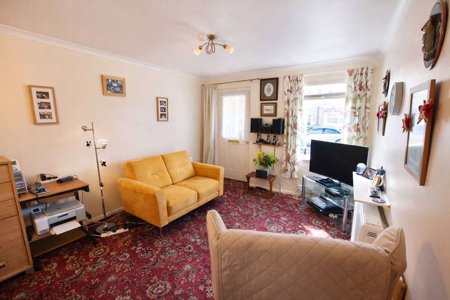 The property is approached via a block-paved frontage, leading to an entrance porch accessed through a double-glazed door. A further internal door opens into a spacious living/dining room, featuring a double-glazed window to the front elevation and an electric heater, creating a bright and welcoming living space.