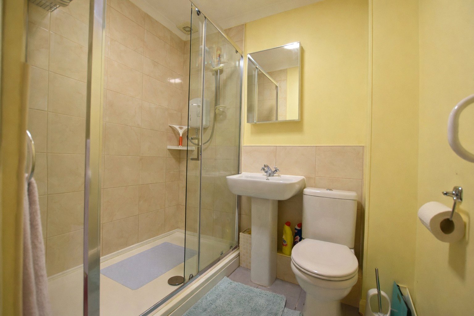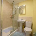 The refitted shower room comprises a large shower enclosure, pedestal wash hand basin, and low-level WC.